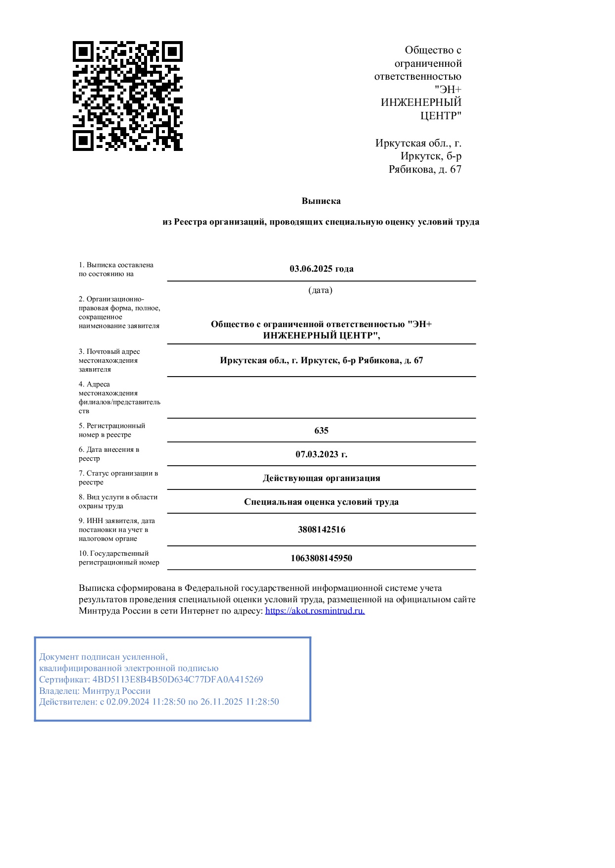 ВЫПИСКА ИЗ РЕЕСТРА ОРГАНИЗАЦИЙ, ПРОВОДЯЩИХ СПЕЦИАЛЬНУЮ ОЦЕНКУ УСЛОВИЙ ТРУДА ПО СОСТОЯНИЮ НА 03 ИЮНЯ 2025 Г.