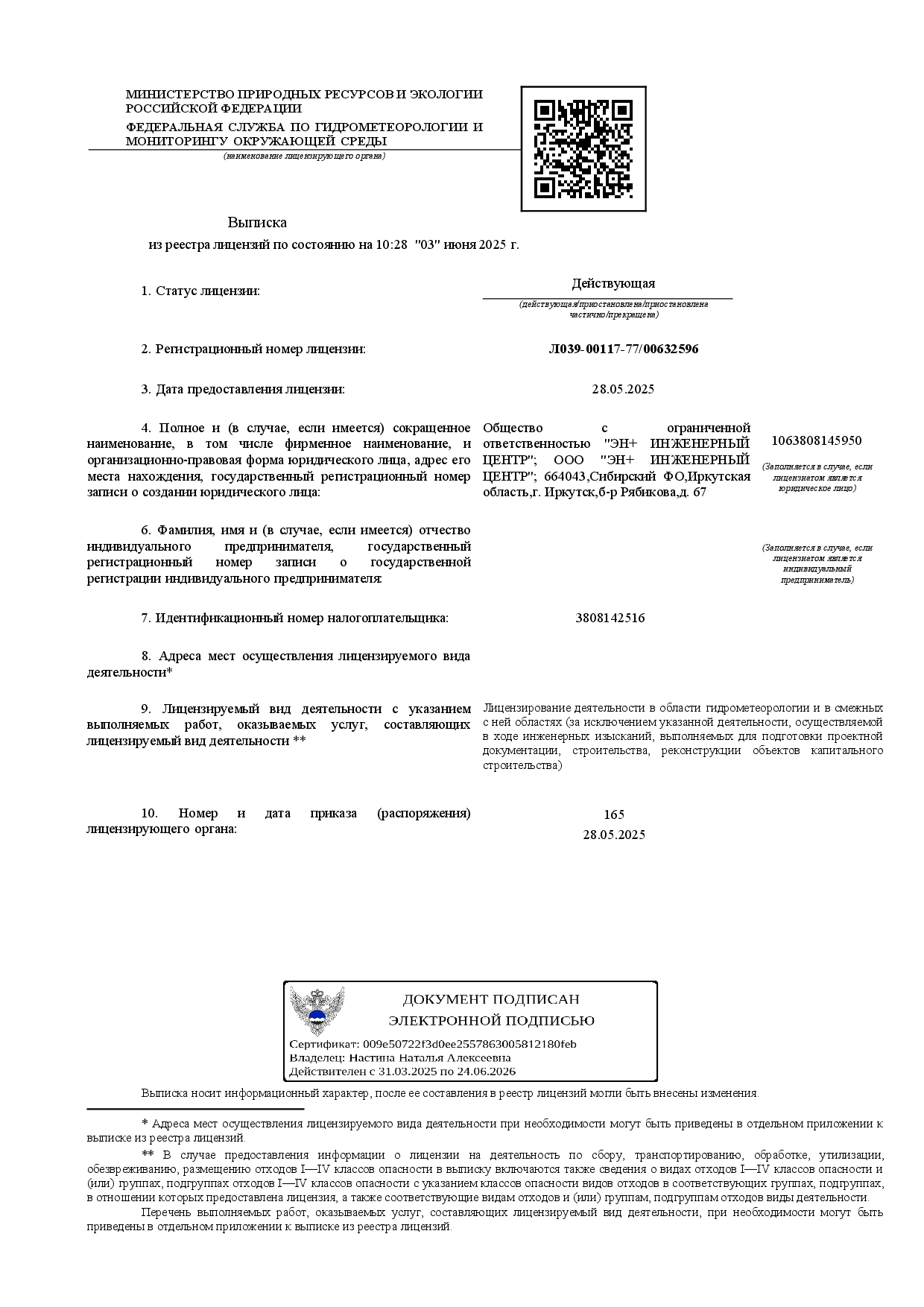 ВЫПИСКА ИЗ РЕЕСТРА ЛИЦЕНЗИЙ В ОБЛАСТИ ГИДРОМЕТЕОРОЛОГИИ И В СМЕЖНЫХ С НЕЙ ОБЛАСТЯХ ПО СОСТОЯНИЮ НА 03 ИЮНЯ 2025