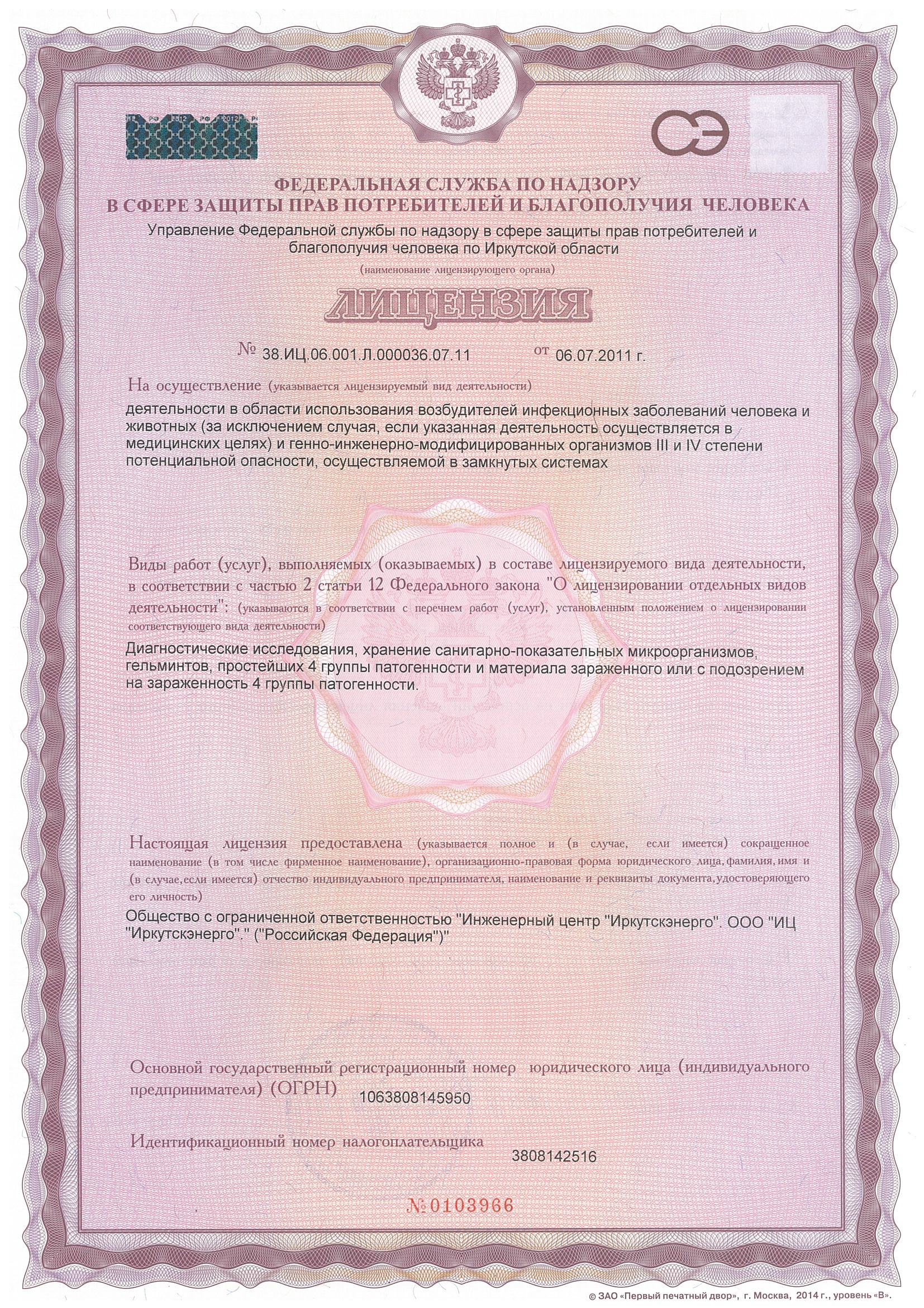 ЛИЦЕНЗИЯ НА ОСУЩЕСТВЛЕНИЕ ДЕЯТЕЛЬНОСТИ, СВЯЗАННОЙ С ИСПОЛЬЗОВАНИЕМ ВОЗБУДИТЕЛЕЙ ИНФЕКЦИОННЫХ ЗАБОЛЕВАНИЙ