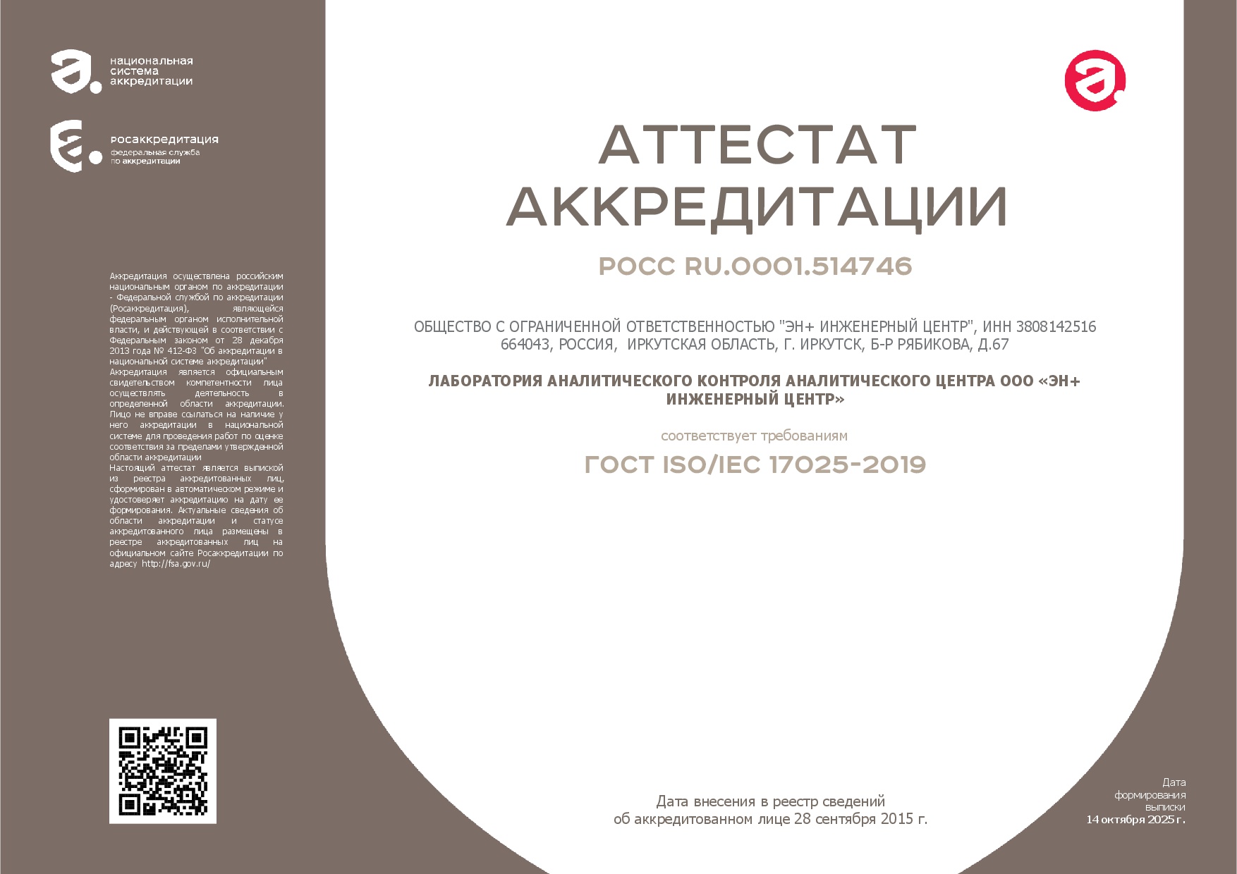 АТТЕСТАТ АККРЕДИТАЦИИ ЛАБОРАТОРИИ АНАЛИТИЧЕСКОГО КОНТРОЛЯ АНАЛИТИЧЕСКОГО ЦЕНТРА ООО «ЭН+ ИНЖЕНЕРНЫЙ ЦЕНТР»